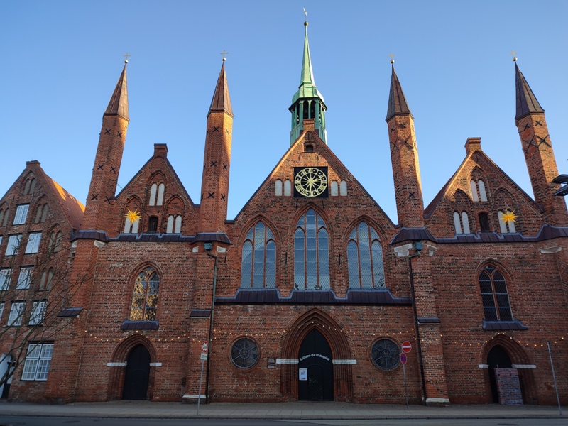 El Hospital del Espíritu Santo de Lubeca, otra obra maestra del estilo gótico báltico, llama poderosamente la atención del viajero con su preciosa fachada de ladrillo rojo con sus cinco torreones delgados coronados por agujas puntiagudas que sobresalen por encima del tejado. En la parte central destaca un campanario con un viejo reloj, que es un emblema de la ciudad.